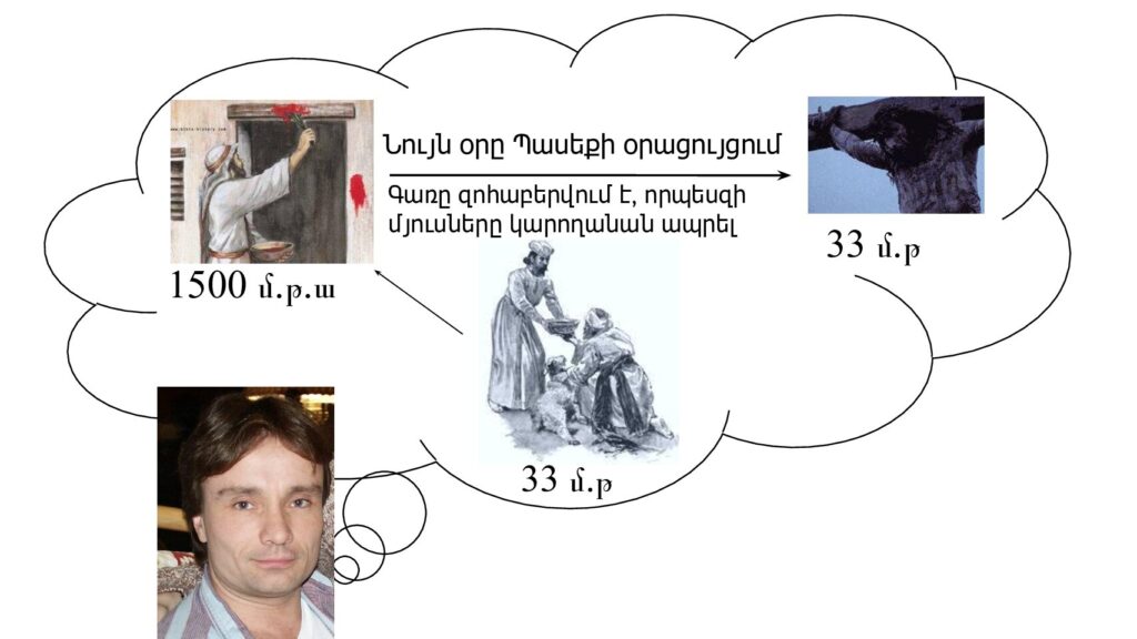 …ես եմ ՏԵՐԸ։ Արյունը [Պասեքի գառան] թող ձեզ համար նշան լինի տների վրա, ուր որ լինելու եք, և տեսնելով արյունը՝ պիտի անցնեմ ձեր վրայով։