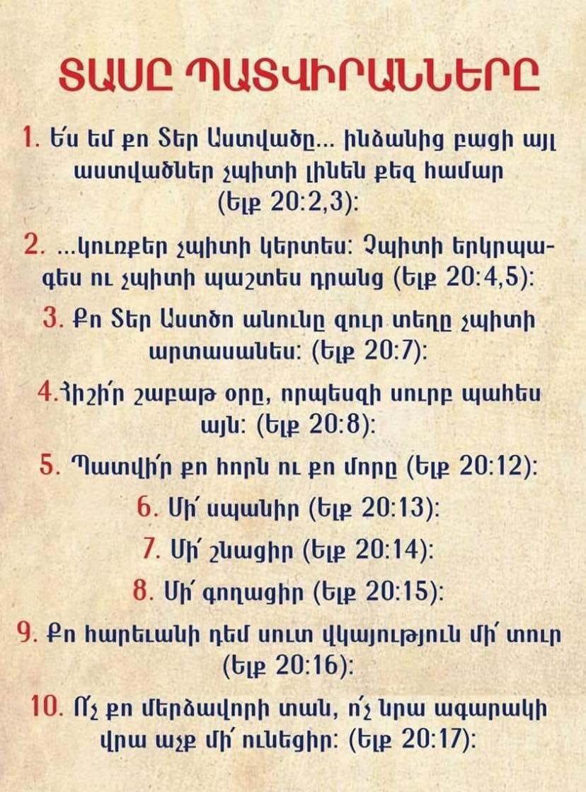 Ահա Տասը Պատվիրանները, որոնք գրվել են Աստծո կողմից քարի վրա։ Այնուհետև Մովսեսը գրանցել է նրանք Աստվածաշնչի «Ելք» գրքում: